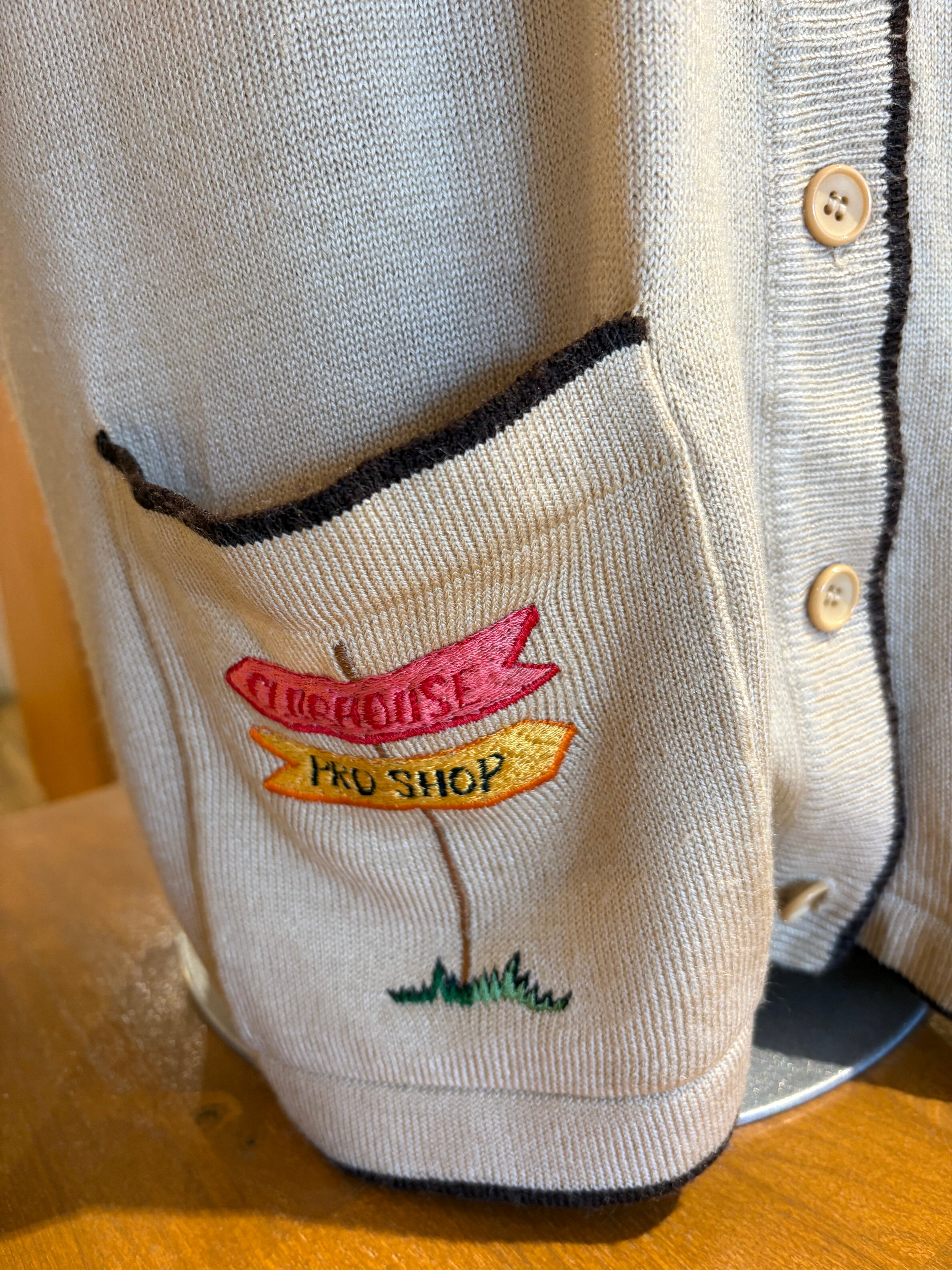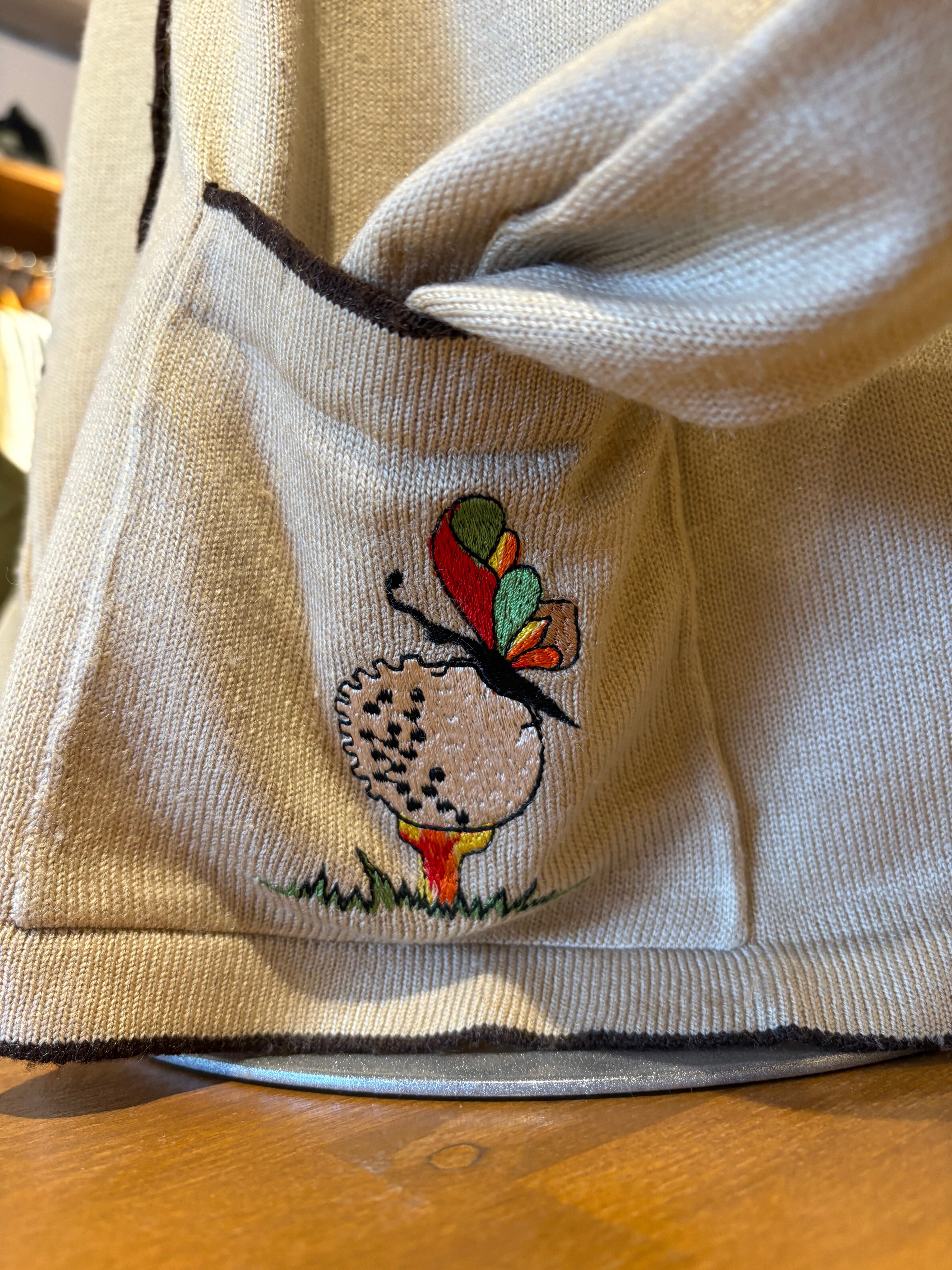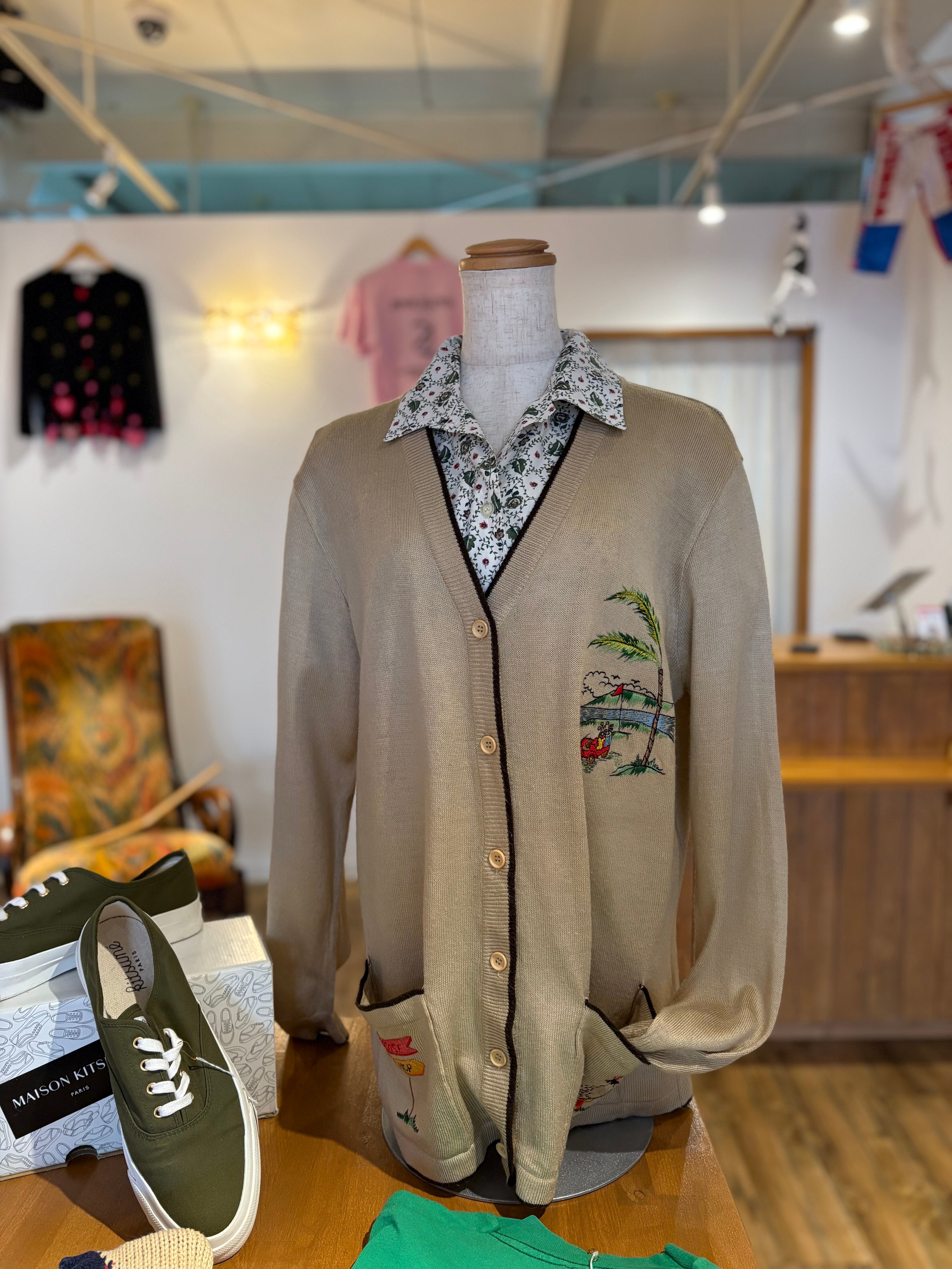 ゴルフにまつわる柄が散りばめられた薄手のカーディガン